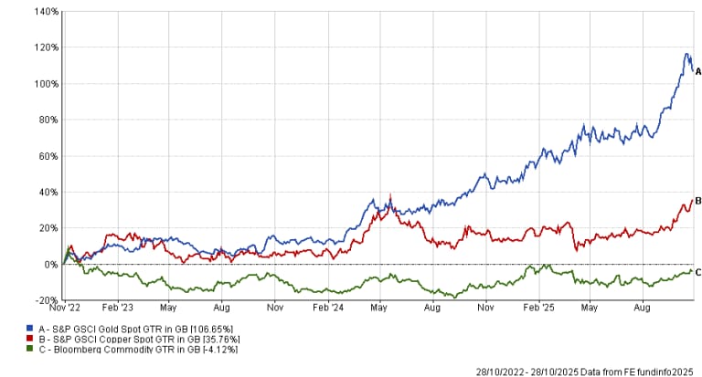 در حالیکه شاخص کامودیتی بلومبرگ (Bloomberg Commodity Index) طی سه سال گذشته زیانده بوده، دو شاخص شاخص تغییرات لحظهای قیمت طلا ( S&P GCSI Gold Spot) و تغییرات لحظهای قیمت مس ( S&P GCSI Copper Spot) بهترتیب بیش از ۱۰۰ درصد و ۳۰ درصد رشد داشتهاند؛ همانطور که در نمودار زیر نشان داده شده است. صندوق BlackRock World Mining Trust از این روند سود برده، چرا که این دو فلز گرانبها اصلیترین محرک بازدهی آن در سال جاری بودهاند. تا پایان سپتامبر ۲۰۲۵، طلا و مس در مجموع حدود ۶۰ درصد از سبد این صندوق را تشکیل دادهاند — بهترتیب با سهم ۳۷.۳ درصد برای طلا و ۲۰.۶ درصد برای مس.