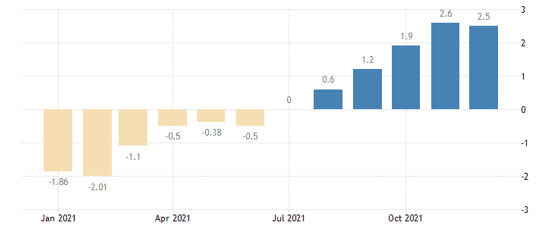تورم سالانه در امارات متحده عربی در دسامبر ۲۰۲۱ از ۲.۵۸ درصد در ماه قبل به ۲.۵ درصد کاهش یافت که بالاترین سطح در ۳۶ ماه گذشته بود که دلیل آن کاهش رشد قیمت در حمل و نقل (۱۷.۹۵ درصد در مقابل ۱۸ درصد) و رستوران ها و هتل ها (۱.۶۰ درصد در مقابل ۲.۰۱ درصد) بود. در همین حال، قیمت مواد غذایی و نوشیدنی به افزایش (۳.۷۱ درصد در مقابل ۳.۶۵ درصد) ادامه داد. از سوی دیگر، قیمت مسکن،  آب و برق (۲.۵۸- درصد در مقابل ۲.۹۹- درصد) و کالاها و خدمات متفرقه (۱.۰۲- درصد در مقابل ۰.۷۲- درصد) بیشتر کاهش یافت. به صورت ماهانه، قیمت مصرف کننده ۰.۰۲ درصد افزایش یافت که از ۰.۵۹ درصد افزایش در نوامبر کمتر بود.
