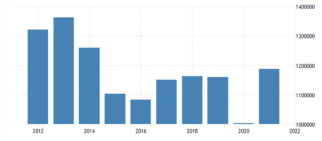 صادرات در امارات متحده عربی از ۱۰۰۳۰۰۰ میلیون درهم در سال ۲۰۲۰ به ۱۱۸۷۴۰۰ میلیون درهم در سال ۲۰۲۱ افزایش یافت.