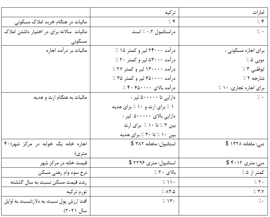 بازار املاک ترکیه همیشه با بازار املاک کشور امارات متحده عربی از سوی سرمایه گذاران ایرانی مورد مقایسه قرار می گیرد هرچند ایران بین 10 کشوری که شهروندانش در امارات متحده عربی املاک مسکونی می خرند جای ندارد. ولی سوال اساسی که در این مورد باید به آن پاسخ داده شود این است که آیا سرمایه گذاری در کشور ترکیه به لحاظ اقتصادی در مقابل سرمایه گذاری در کشور امارات متحده عربی توجیه اقتصادی داشته است؟ در ادامه سرمایه گذاری در بخش مسکن هر دو کشور از جنبه اقتصادی مورد تجزیه و تحلیل قرار گرفته و متغیرهای اقتصادی که می توانند بر سرمایه گذاری در بخش مسکن اثرگذار باشند بررسی خواهند شد.