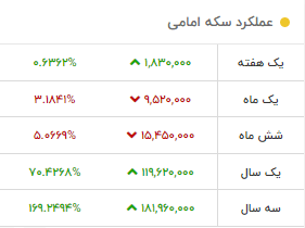 در بازار ایران امروز قیمت سکه طرح جدید با ۵۰ هزار تومان کاهش، قیمت سکه طرح قدیم با ۲۰۰ هزار تومان افزایش ،قیمت نیم سکه با ۵۰ هزار تومان کاهش، ربع سکه با ۵۰ هزار تومان کاهش و سکه های گرمی بانک مرکزی نیز با ۵۰ هزار تومان افزایش و هر گرم طلای ۱۸عیار نیز با ۳ هزار تومان کاهش نسبت به روز گذشته داد و ستد می شود.